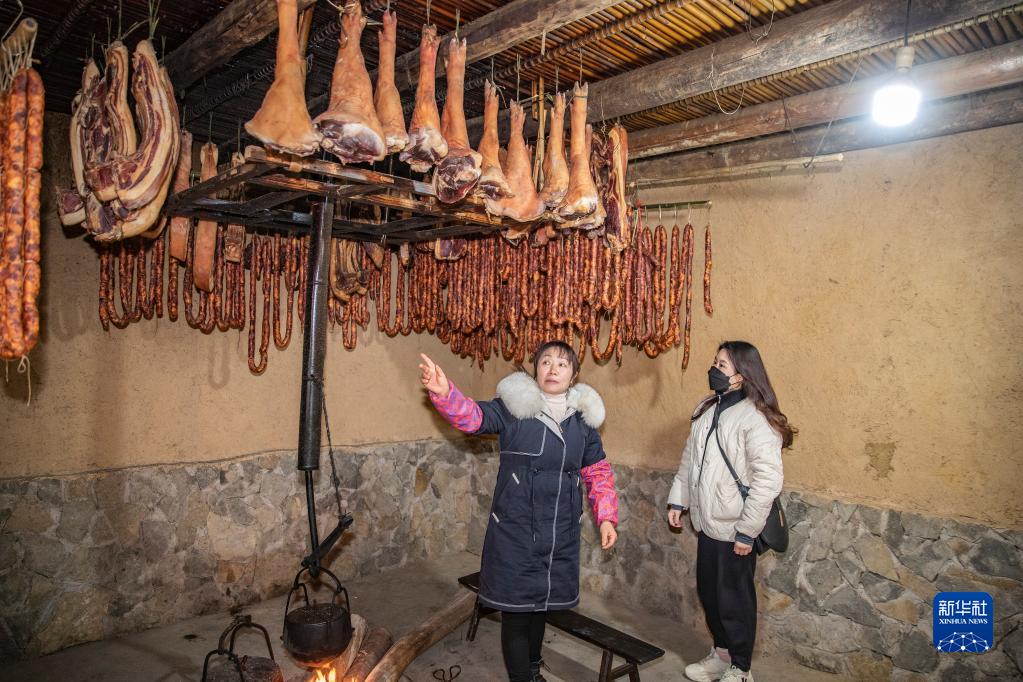 1月4日,在重慶市城口縣厚坪鄉紅色村,村民何宜香(左)向前來(lái)購買(mǎi)臘肉的消費者介紹正在熏制的臘肉產(chǎn)品。