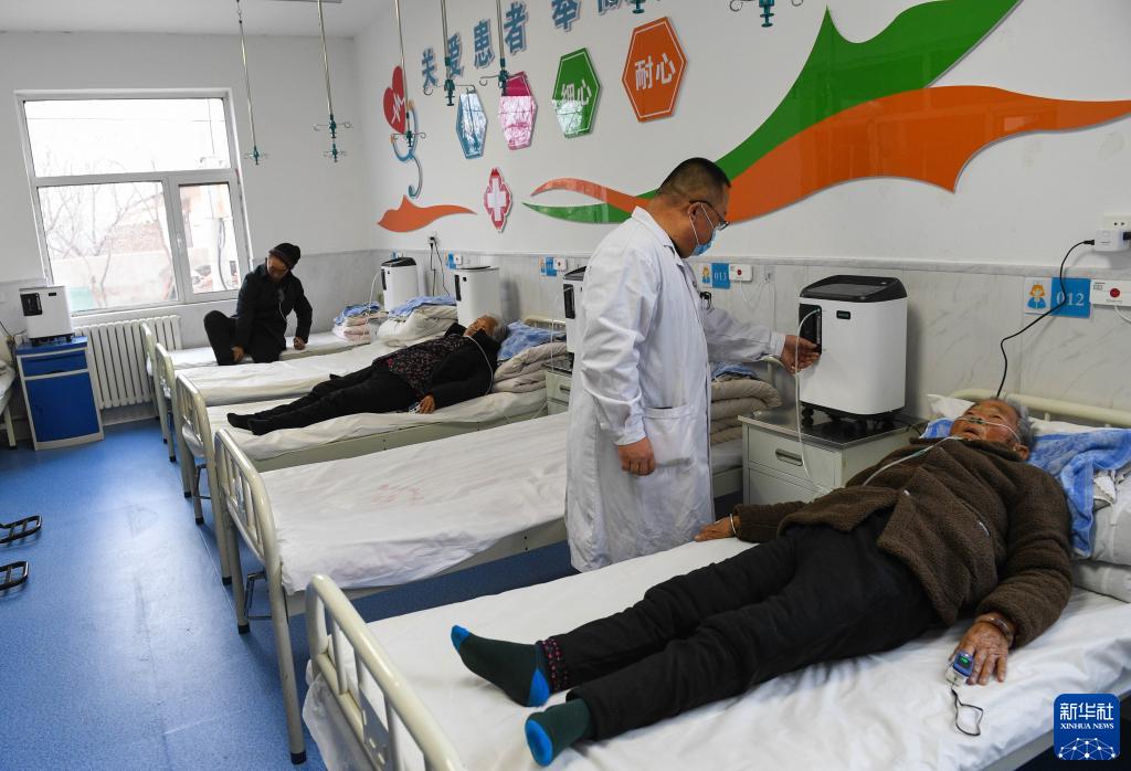 1月5日,在達拉特旗恩格貝中心衛生院,醫務(wù)人員在操作制氧設備讓患者吸氧。