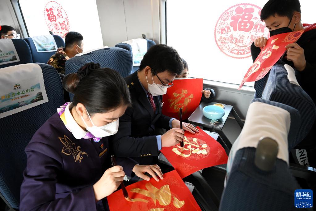 1月6日,鐵路工作人員在列車(chē)上為乘客寫(xiě)“?!弊?。