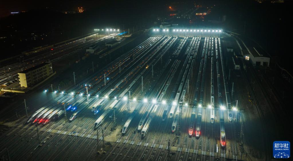 1月7日,2023年春運啟動(dòng)。當日凌晨,??吭诤祥L(cháng)沙動(dòng)車(chē)運用所的動(dòng)車(chē)組列車(chē)排列整齊,如同一支“陸地艦隊”。