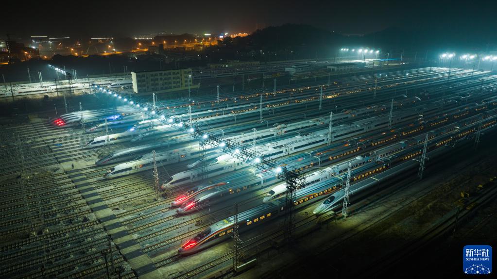 1月7日,2023年春運啟動(dòng)。當日凌晨,??吭诤祥L(cháng)沙動(dòng)車(chē)運用所的動(dòng)車(chē)組列車(chē)排列整齊,如同一支“陸地艦隊”。
