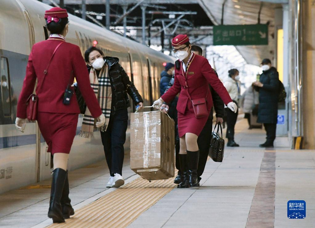 1月7日,在北京西站,G1579次列車(chē)的乘務(wù)員在發(fā)車(chē)前幫旅客拿行李。