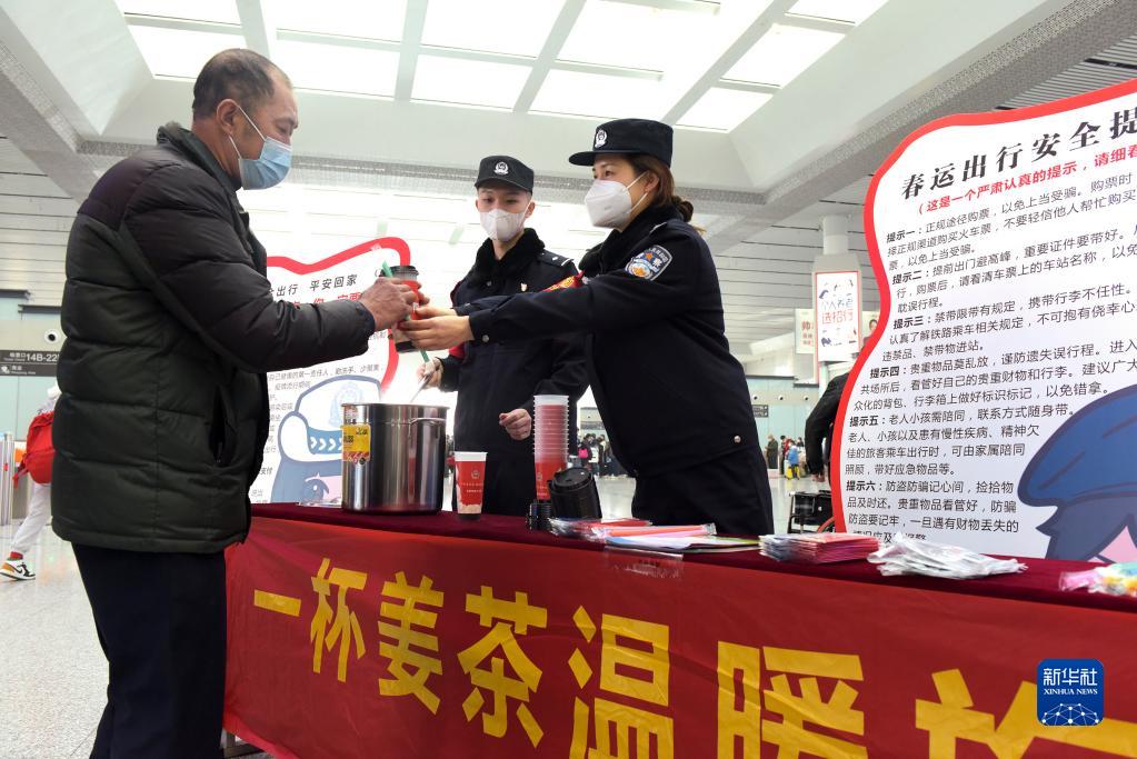 1月7日,在安徽合肥南站內,合肥鐵路公安處民警張婷(右)、王子棋(中)給一名旅客送上免費姜茶。