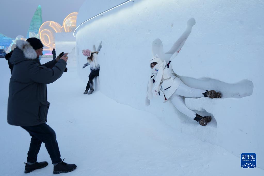 1月6日,游客在哈爾濱冰雪大世界園區的雪墻前拍照。