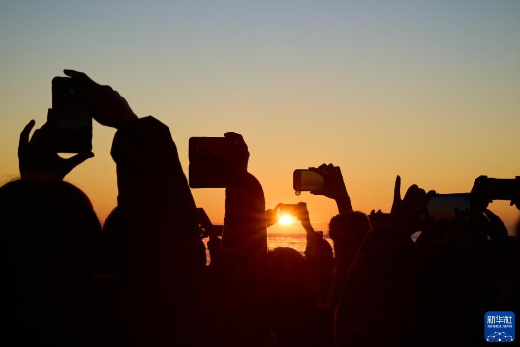 1月1日,人們在日本茨城縣大洗町的海邊拍攝日出。