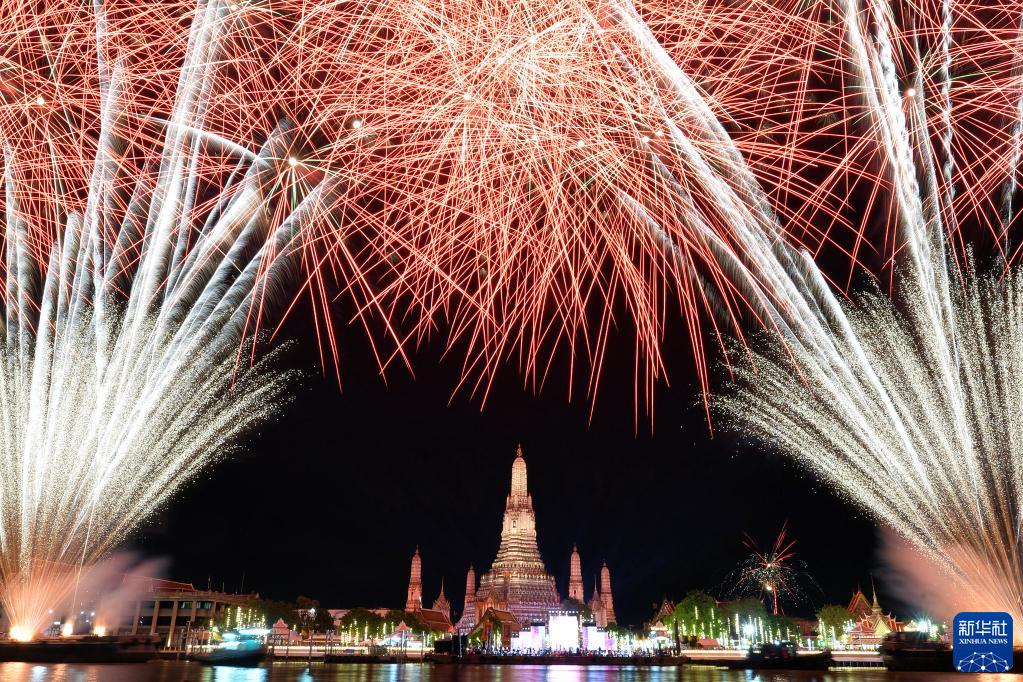 這是1月1日在泰國曼谷鄭王廟上空拍攝的新年煙花。