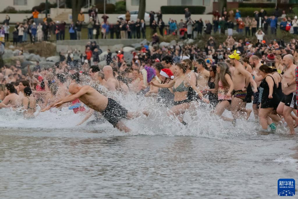 1月1日,在加拿大溫哥華,人們參加冬泳活動(dòng)迎接新年的到來(lái)。