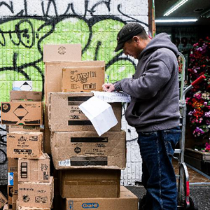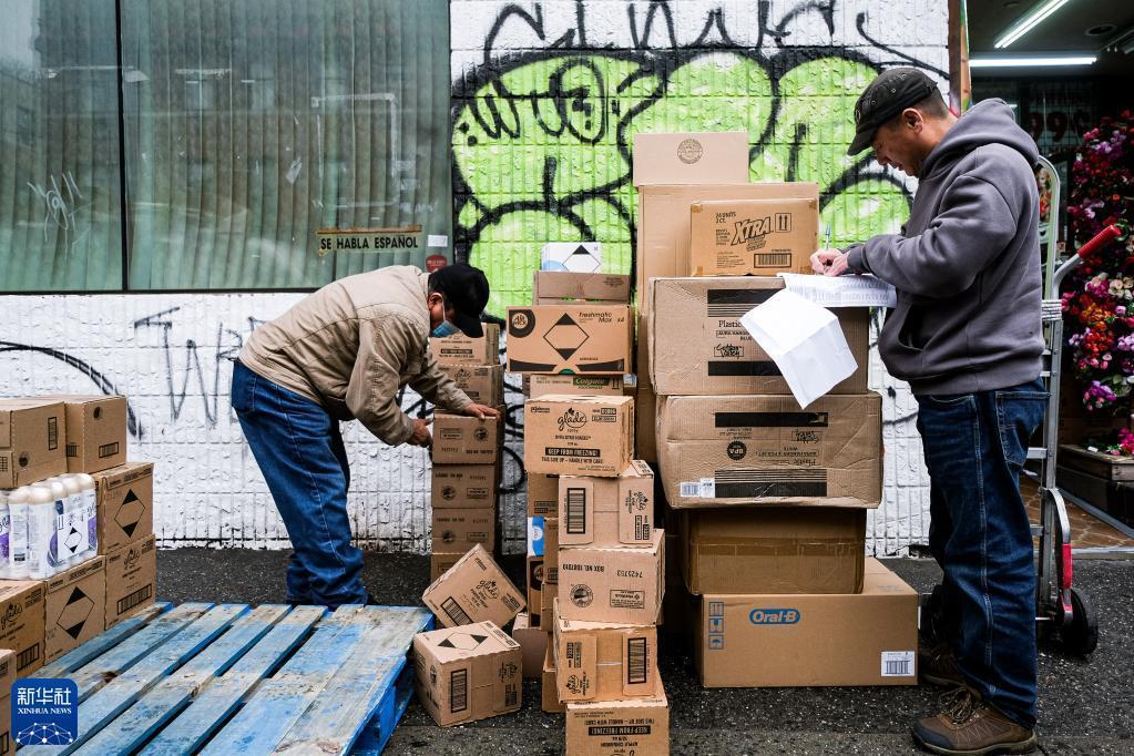 1月6日,兩名工人在美國紐約一家商店門(mén)口卸貨。