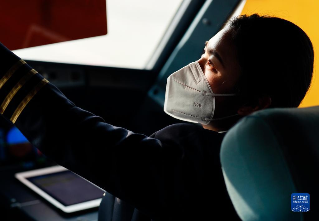 1月6日,重慶航空客機駕駛艙內,擔任副駕駛的楊靜協(xié)助她所在航班機長(cháng)進(jìn)行駕駛艙內的起飛前準備工作。