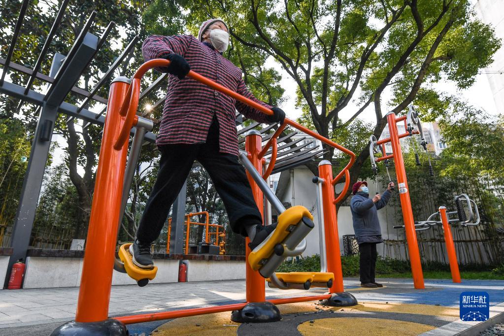 在江蘇省蘇州市姑蘇區二郎巷社區,社區居民在鍛煉(1月6日攝)。