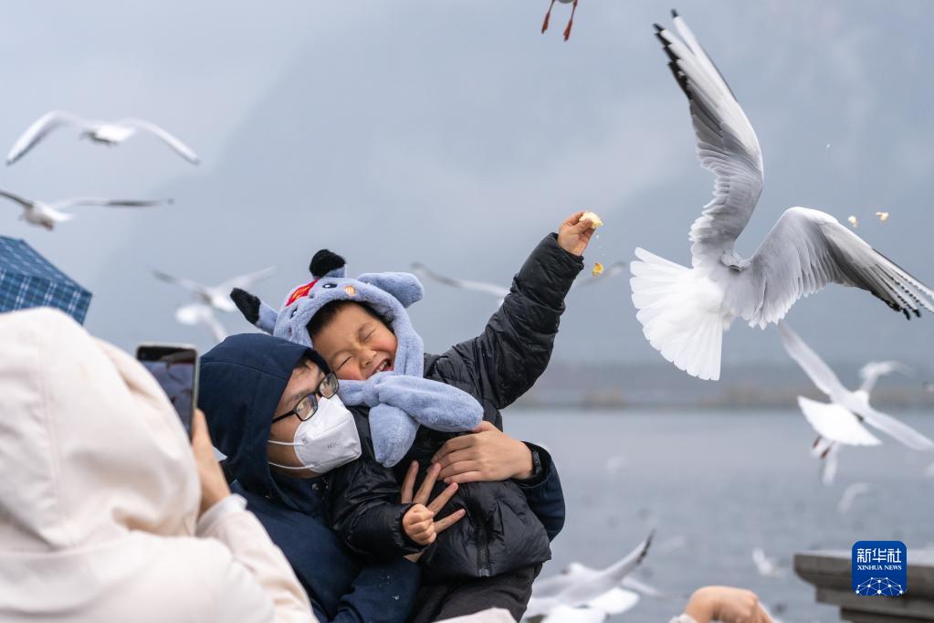 游客在云南昆明滇池海埂大壩投喂紅嘴鷗(2023年1月1日攝)。