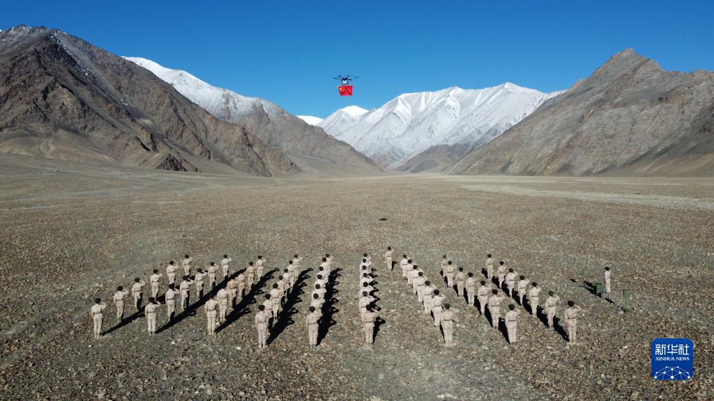 在藏北高原無(wú)人區駐訓的新疆軍區某紅軍團在雪山腳下組織官兵使用無(wú)人機舉行升國旗儀式(2023年1月1日攝)。新年第一天,解放軍和武警部隊官兵堅守戰位,以軍人特有的方式迎接新一年的到來(lái)。