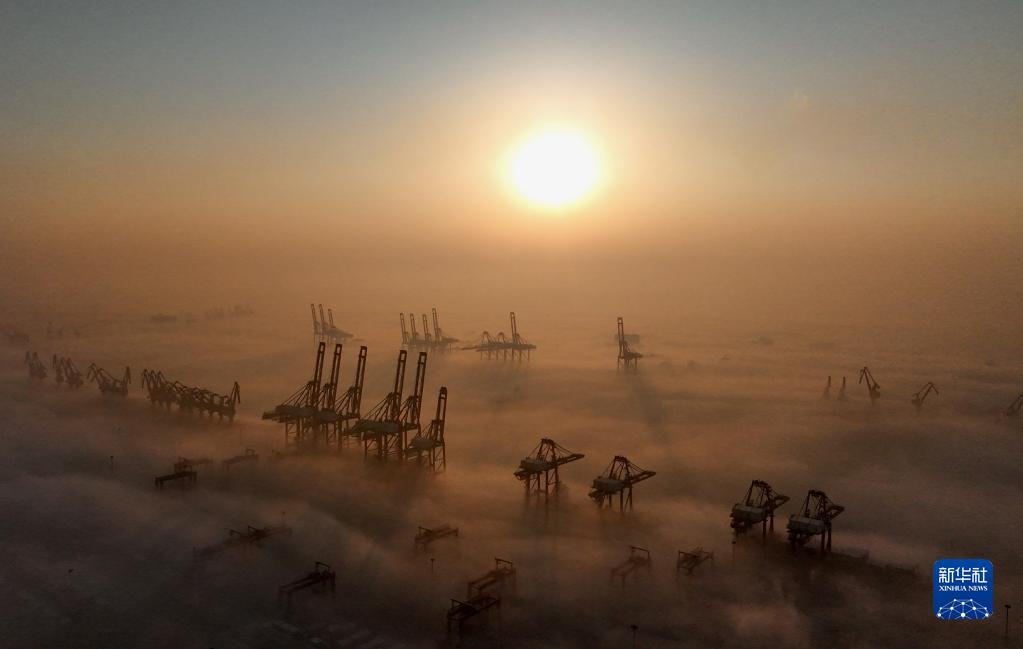 河北省唐山港京唐港區出現平流霧景觀(guān)(2023年1月5日攝,無(wú)人機照片)。
