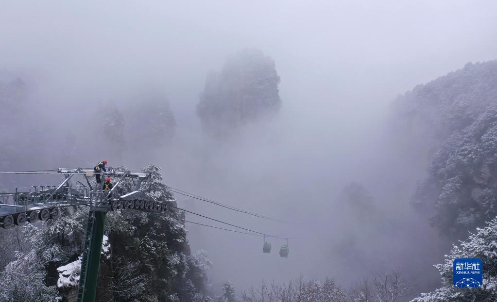 湖南張家界武陵源景區楊家界索道工作人員在索道支架上進(jìn)行巡檢(2023年1月2日攝,無(wú)人機照片)。近日,湖南張家界武陵源景區出現低溫冰雪天氣,當地旅游管理部門(mén)對景區內高空客運索道進(jìn)行安全隱患排查,保障游客安全。