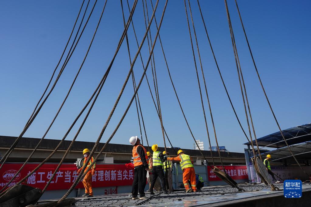 1月7日,施工人員在深江鐵路深莞隧道西段出口明挖隧道吊裝首幅地連墻鋼筋籠。