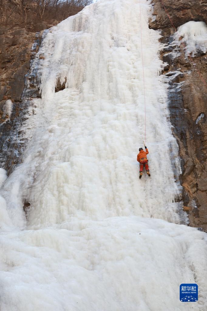 近日,河北邢臺市云夢(mèng)山景區內的七疊瀑形成壯觀(guān)冰壁,吸引不少游客前來(lái)游玩。攀冰愛(ài)好者借助專(zhuān)業(yè)工具,在專(zhuān)職教練的指導下體驗攀冰,成為太行山冬日里一道別樣風(fēng)景。