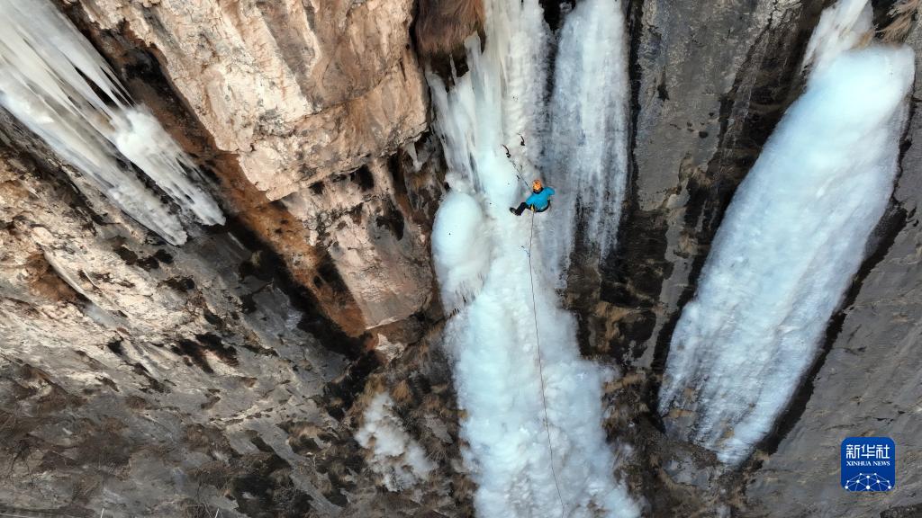 1月8日,在云夢(mèng)山景區,攀冰愛(ài)好者在冰壁上攀爬(無(wú)人機照片)。