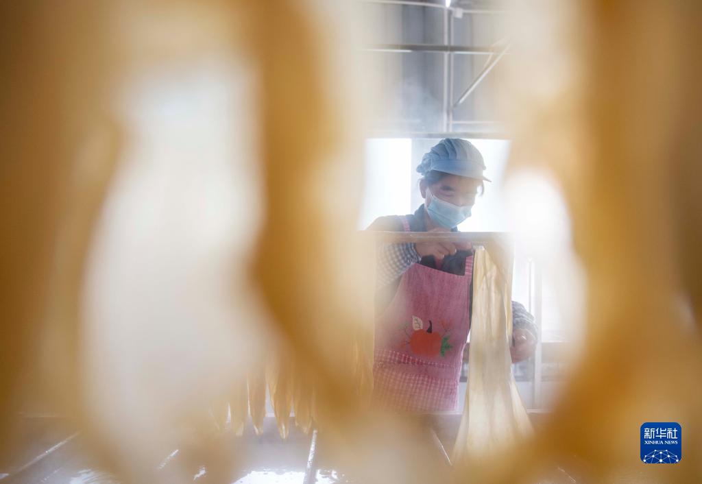 1月8日,在湖南省永州市江華瑤族自治縣涔天河鎮一家腐竹加工廠(chǎng),工人在生產(chǎn)腐竹。
