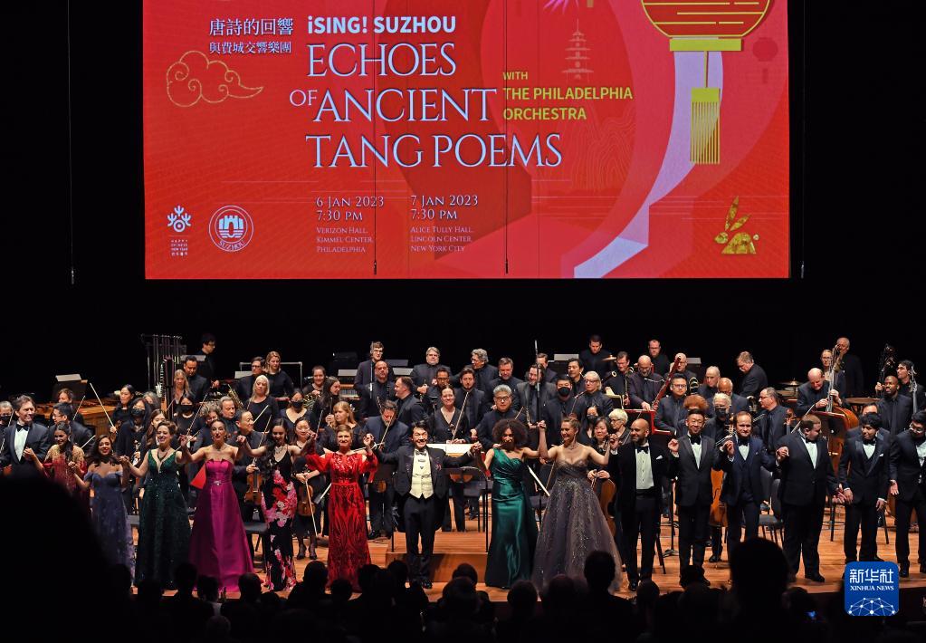 1月7日,在美國紐約林肯中心,參加“唐詩(shī)的回響”新春音樂(lè )會(huì )的藝術(shù)家謝幕。