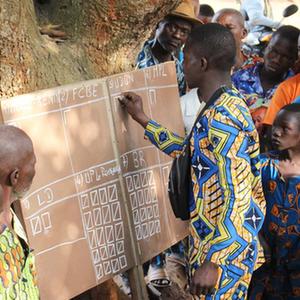 1月8日,選民們在貝寧阿波美一處投票站查看選民登記表上的內容。
