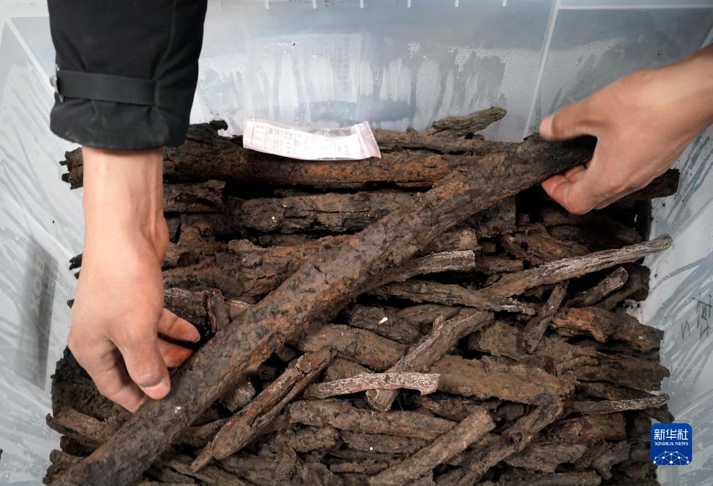 考古工作人員在整理河南商丘宋國故城遺址收集的桑樹(shù)枝(1月6日攝)。