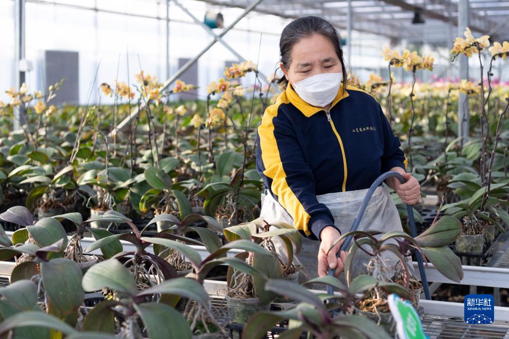 1月9日,工作人員在北大荒建三江國家農業(yè)科技園區內給植物澆水。