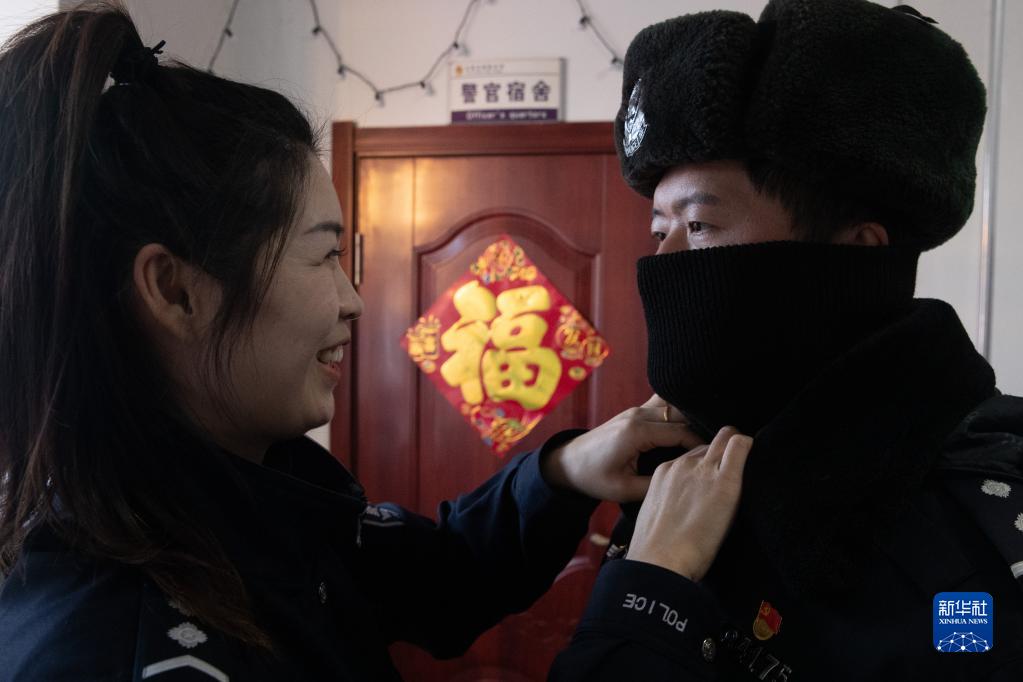 1月8日,在洛古河夫妻警務(wù)室,沈欣給即將去江面巡邏的史先強整理服裝。