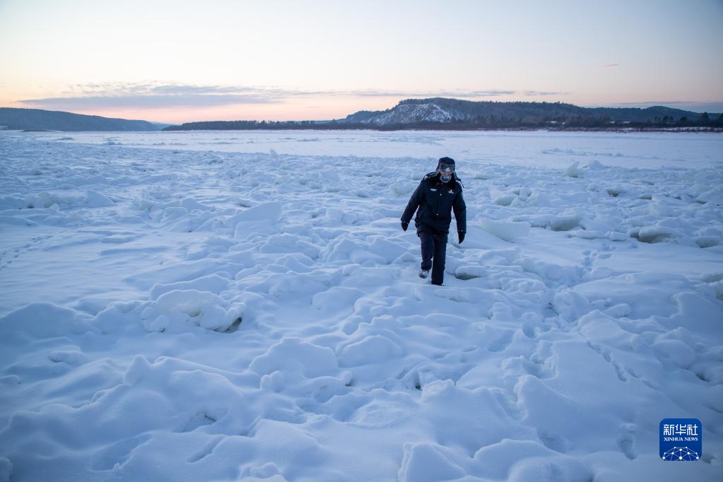 1月8日,史先強在洛古河村旁封凍的黑龍江江面上進(jìn)行邊境巡邏。