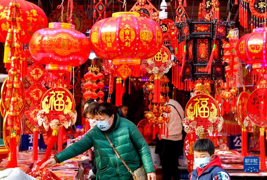 1月9日,市民在安徽省亳州市譙城區一家年貨市場(chǎng)選購新春飾品。