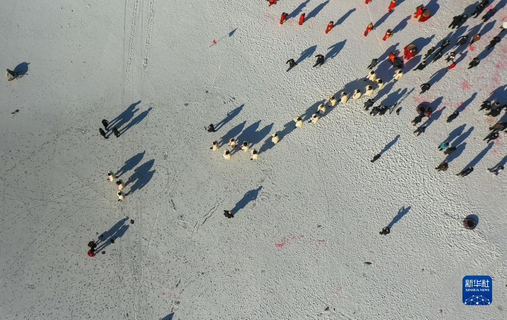 1月9日,在土默特左旗哈素海,身穿白色外套的冬捕人出發(fā)捕魚(yú)(無(wú)人機照片)。