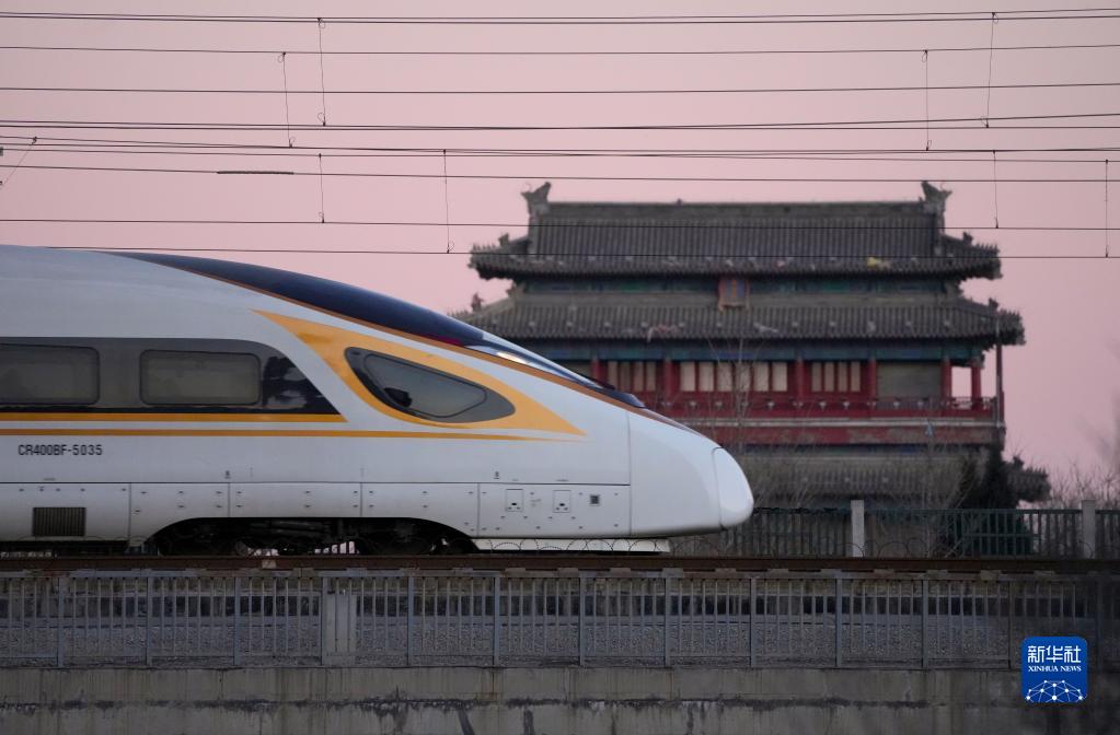 2022年1月17日清晨,一列動(dòng)車(chē)組列車(chē)駛過(guò)北京永定門(mén)城樓。當日,2022年春運啟動(dòng)。