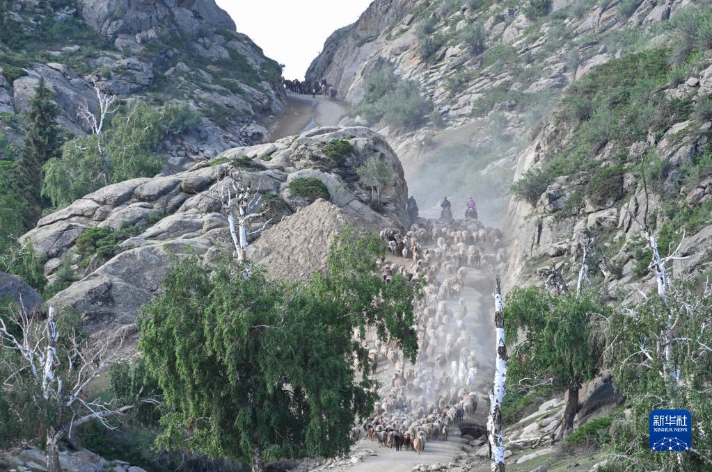 2022年6月5日,在新疆阿勒泰地區福??h沙爾布拉克春秋牧場(chǎng)轉往夏季牧場(chǎng)的牧道上,牧民趕著(zhù)牲畜向夏季牧場(chǎng)進(jìn)發(fā)。