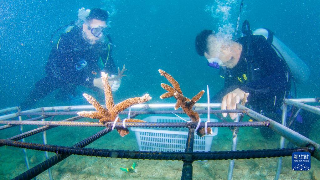 2022年6月7日,海南省海洋與漁業(yè)科學(xué)研究院的專(zhuān)家和分界洲島旅游區工作人員在海南省陵水黎族自治縣分界洲島附近海域移植珊瑚。