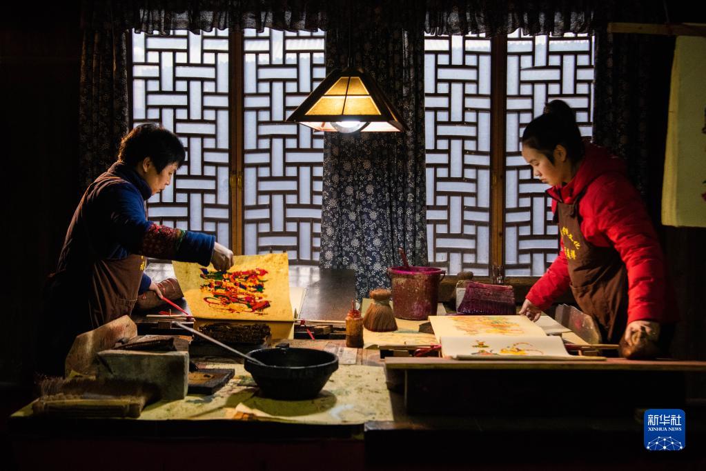 2022年1月21日,在湖南省邵陽(yáng)市隆回縣灘頭鎮一家年畫(huà)作坊,年畫(huà)藝人尹冬香(左)和女兒肖揚在印制年畫(huà)。