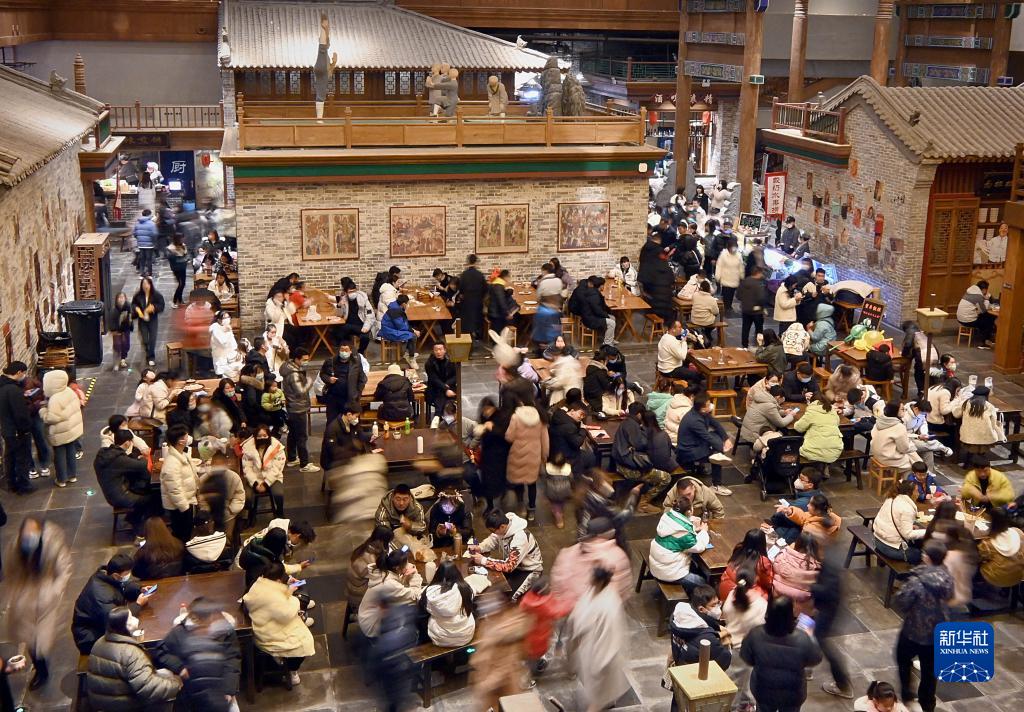 2022年12月31日,游客在位于河南省鄭州市中牟縣的電影小鎮餐廳就餐。元旦假期,各地消費市場(chǎng)人氣漸旺,暖意漸濃。