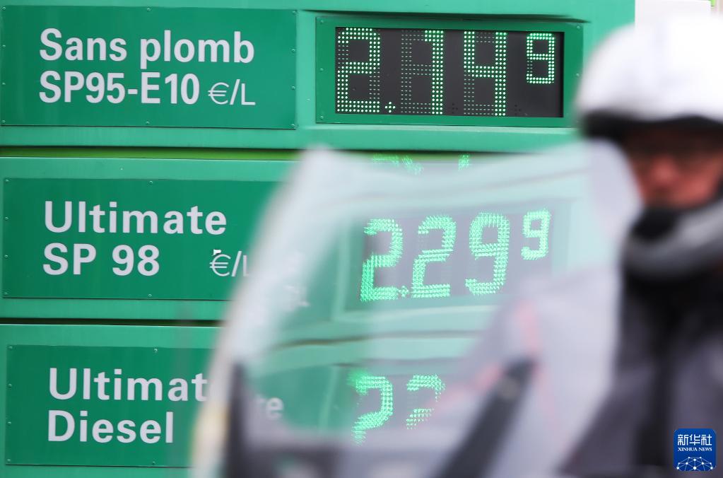 2022年3月16日,一名男子騎摩托車(chē)經(jīng)過(guò)法國巴黎一處加油站。法國燃油價(jià)格持續上漲,柴油和汽油平均價(jià)格都已超過(guò)每升2歐元的門(mén)檻。