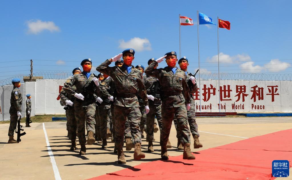 2022年7月1日,在黎巴嫩南部辛尼亞村的中國維和部隊營(yíng)區,中國維和部隊官兵在受勛后通過(guò)觀(guān)禮臺。聯(lián)合國駐黎巴嫩臨時(shí)部隊(聯(lián)黎部隊)當日授予中國第20批赴黎巴嫩維和部隊全體410名官兵聯(lián)合國“和平勛章”,以表彰他們?yōu)槔璋湍勰喜康貐^和平穩定作出的突出貢獻。