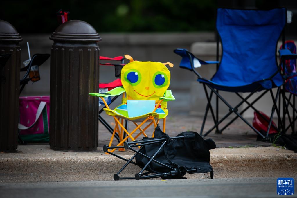 2022年7月4日,觀(guān)眾座椅遺留在美國伊利諾伊州海蘭帕克市“獨立日”游行的槍擊現場(chǎng)。海蘭帕克市“獨立日”游行槍擊事件造成至少7人死亡、數十人受傷。