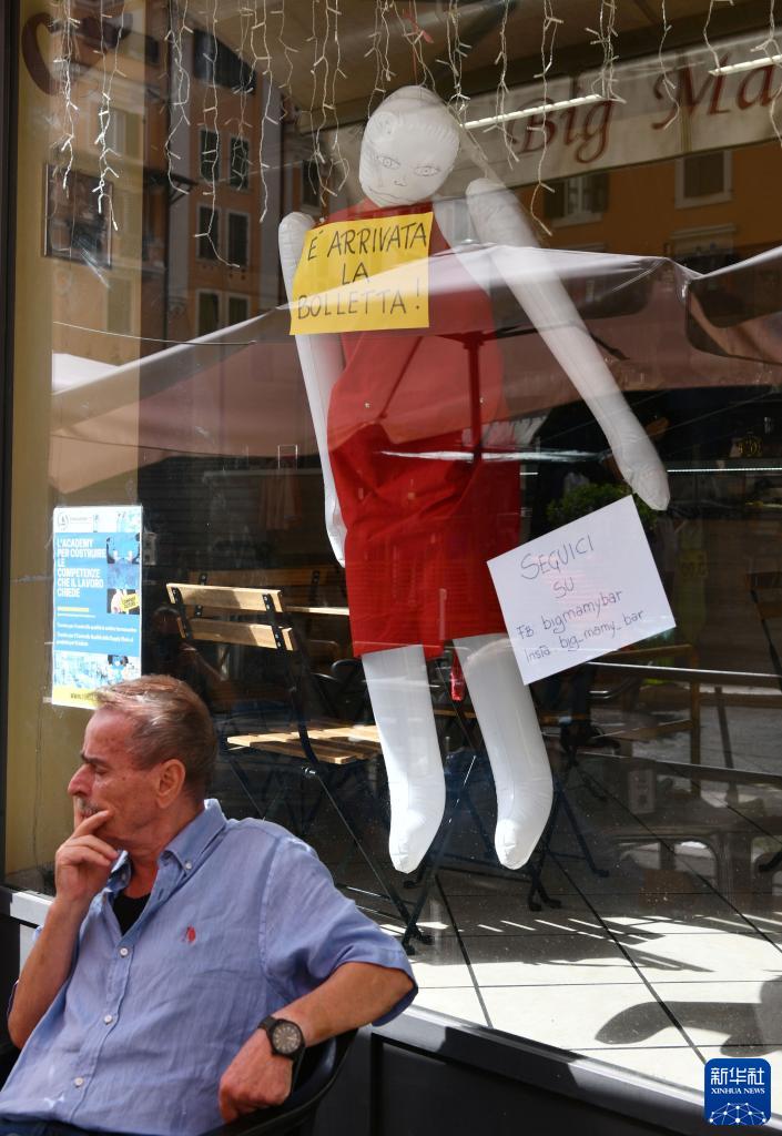 2022年9月17日,意大利羅馬一家餐館擺出人偶和“賬單已到!”字樣的紙牌,以此表達對餐館收到的高額電費賬單的不滿(mǎn)。受歐洲能源危機影響,意大利經(jīng)營(yíng)者和民眾的能源支出普遍上漲,不堪重負。