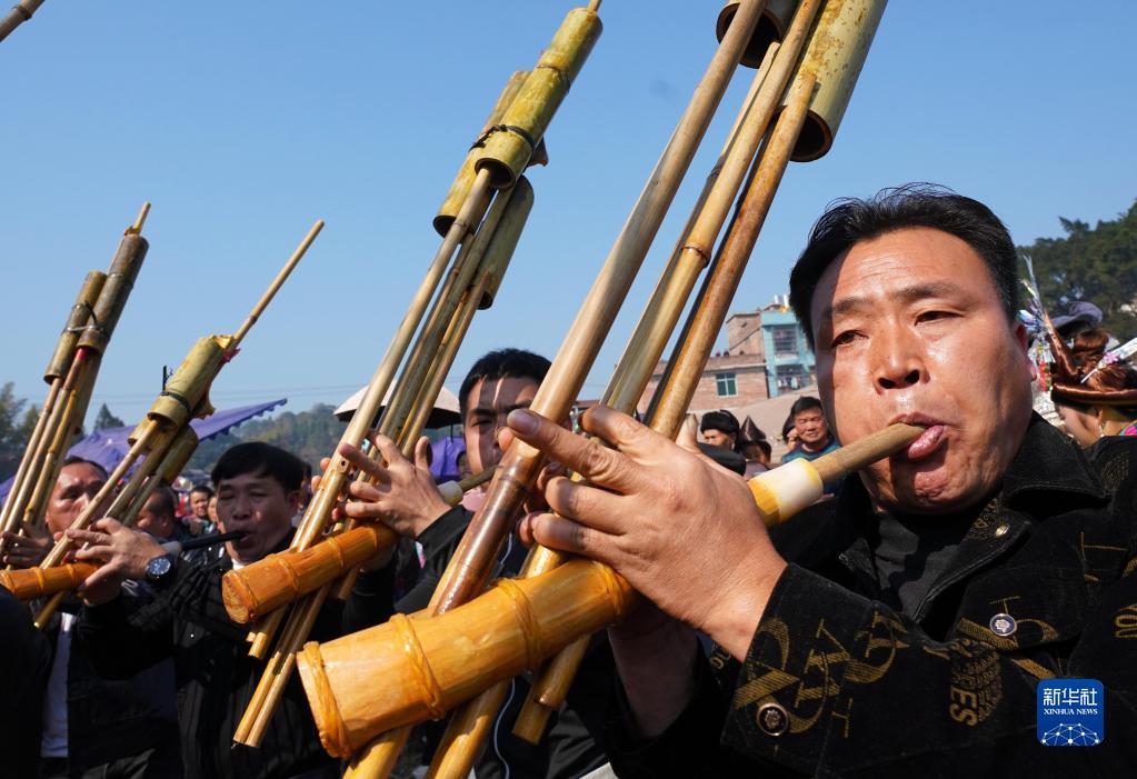 1月9日,在融水縣良寨鄉,村民在吹奏蘆笙。