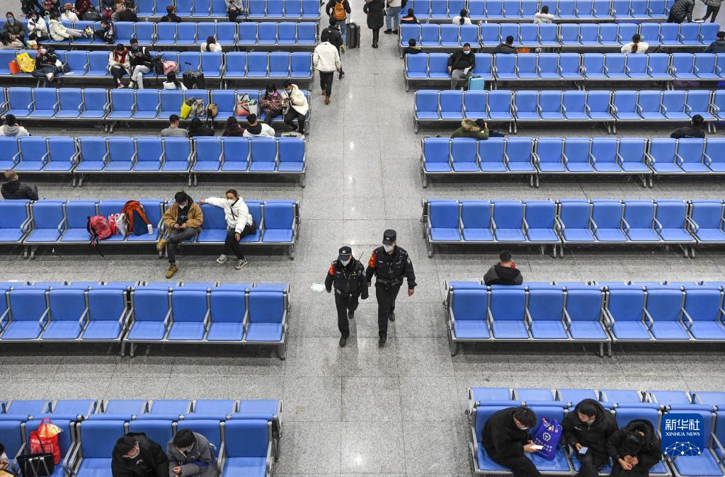 1月8日,鐵路警察王云(左)和謝源在貴陽(yáng)東站候車(chē)室進(jìn)行站區巡查。
