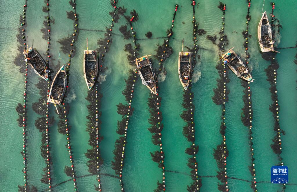 2022年11月1日,在山東榮成愛(ài)倫灣海洋牧場(chǎng),漁民駕駛漁船收獲牡蠣(無(wú)人機照片)。