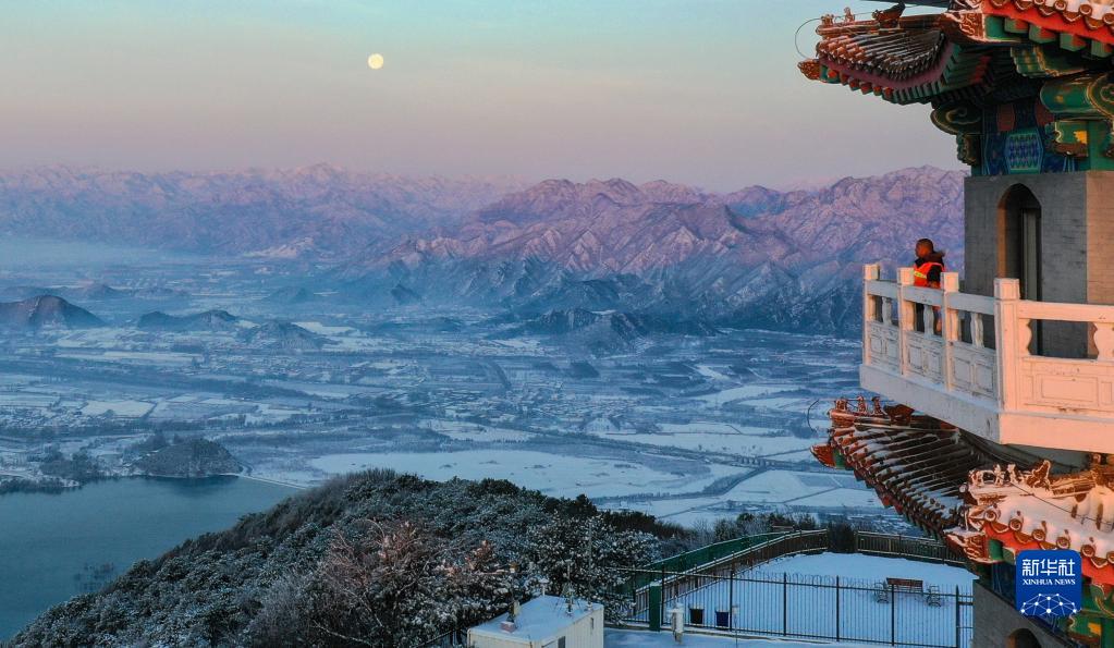2022年3月19日,站在瞭望塔上的宋臣開(kāi)始了一天的工作(無(wú)人機照片)。宋臣是北京市十三陵林場(chǎng)管理處駐守蟒山瞭望塔的護林員。他的職責是守護在瞭望塔上,看護著(zhù)周?chē)?.3萬(wàn)余畝范圍內國家級重點(diǎn)公益林。