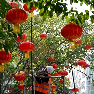 1月7日,工人在四川省南充市蓬安縣城區街道懸掛紅燈籠。