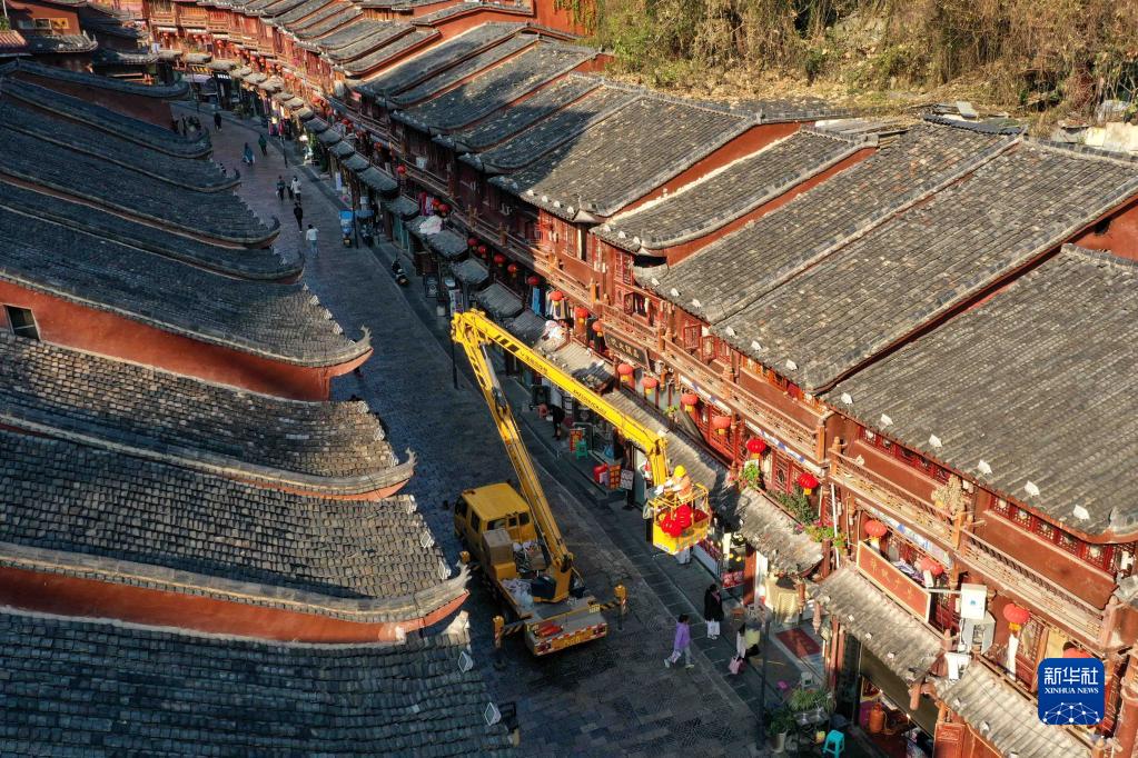 1月9日,工人在貴州省都勻市石板街懸掛紅燈籠(無(wú)人機照片)。