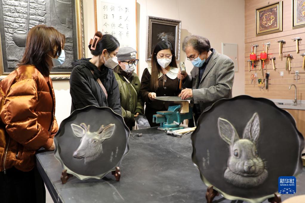 1月9日,在石家莊市灣里廟步行街郭海博民間文藝家工作室,鐵板浮雕藝術(shù)家郭海博(右一)在向觀(guān)眾介紹鐵板浮雕技藝。
