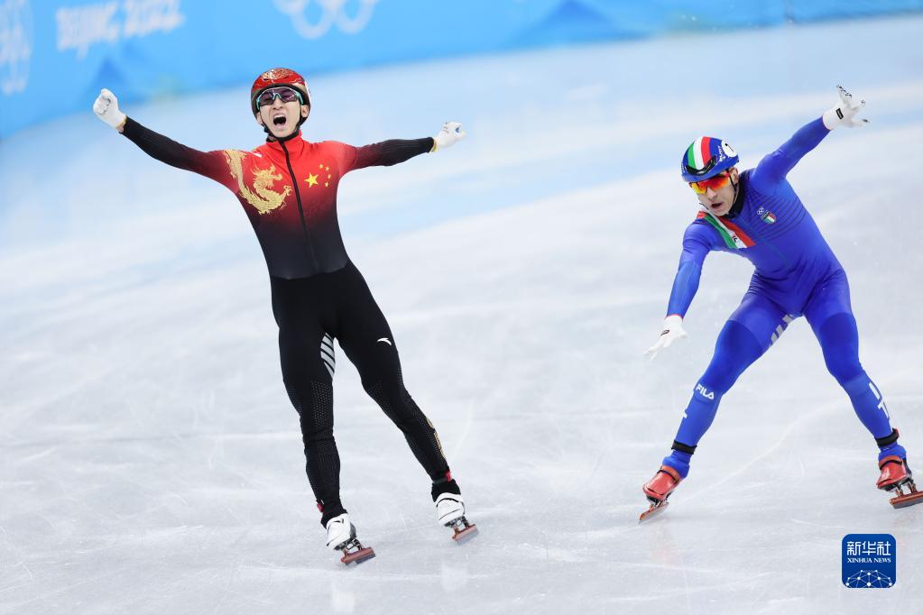 2022年2月5日,中國隊選手武大靖(左)在比賽后慶祝。