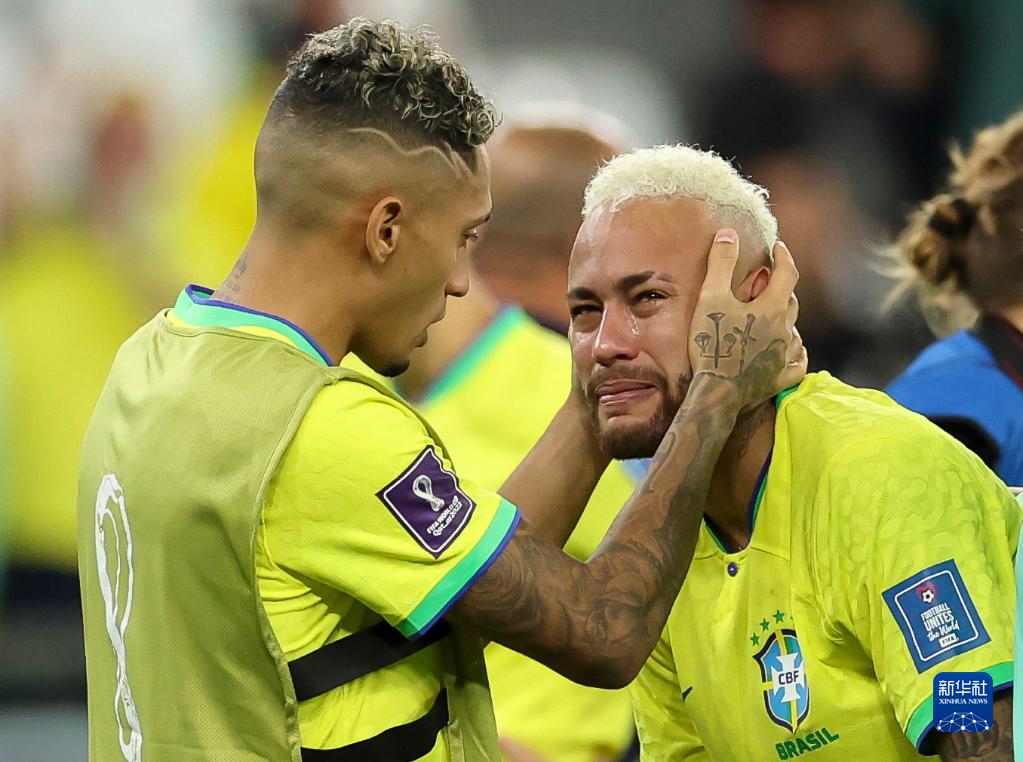 2022年12月9日,巴西隊球員拉菲尼亞(左)在比賽后安慰隊友內馬爾。