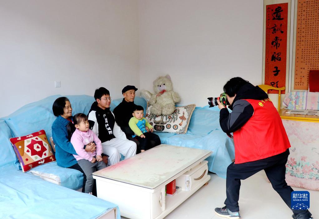1月9日,在甘肅省平?jīng)鍪徐o寧縣威戎鎮楊灣村,一名志愿者在給村民拍攝全家福。