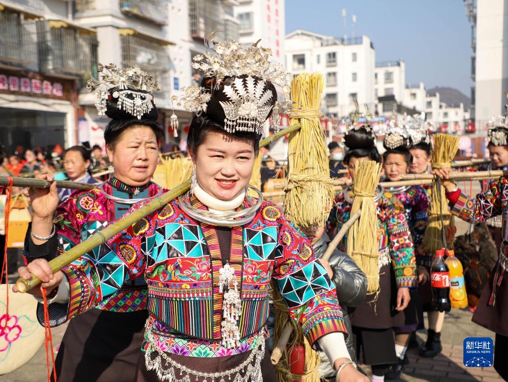 1月9日,在貴州省丹寨縣金泉街道移民安置社區,身著(zhù)節日盛裝的苗族群眾參加民俗展示巡游活動(dòng)。